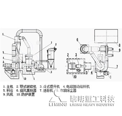 高压悬辊磨整套设备由主机、减速机、分析机、管道装置、鼓风机、除尘器、颚式破碎机、斗式提升机、电磁振动给料机、电控系统等组成。
